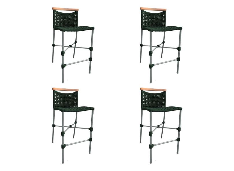 Kit 4 Banquetas Anne em Corda Náutica Base em Alumínio Cinza com Detalhe em Madeira Verde Musgo