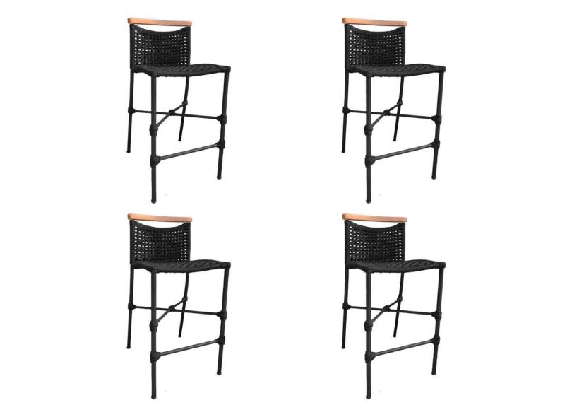 Kit 4 Banquetas Anne em Corda Náutica Base em Alumínio Preta com Detalhe em Madeira Preta