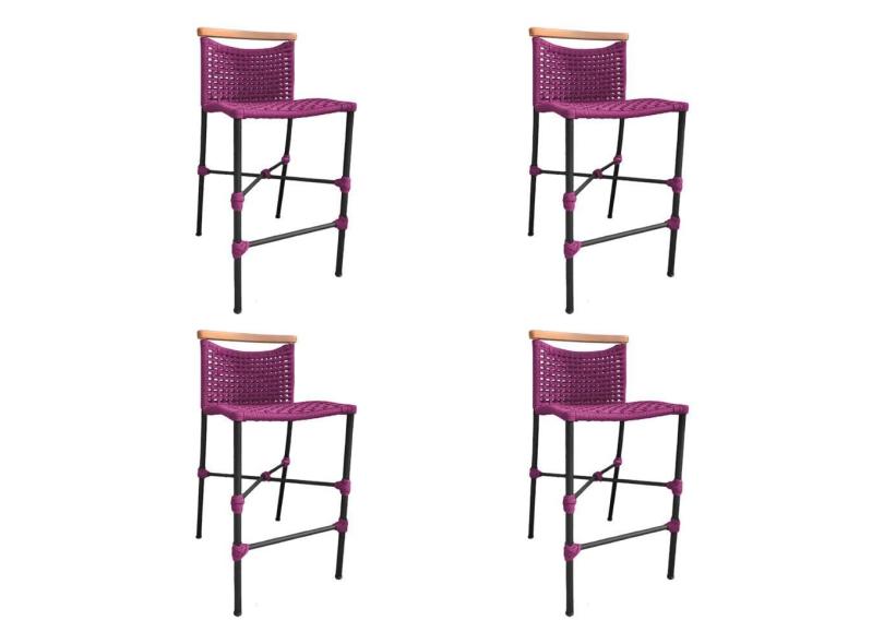 Kit 4 Banquetas Anne em Corda Náutica Base em Alumínio Preta com Detalhe em Madeira Rosa