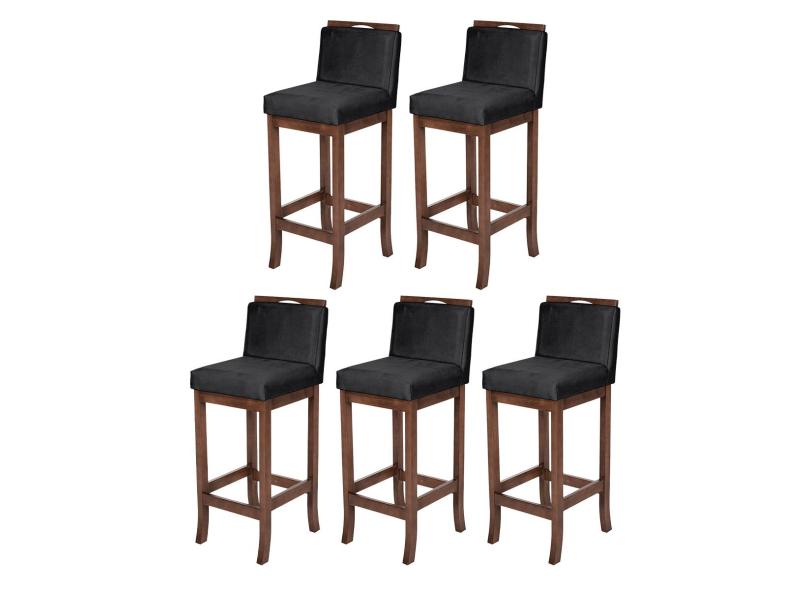 Kit 5 Banquetas Média com Encosto Turim Madeira Capuccino Suede Preto ccs