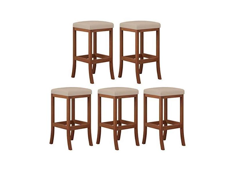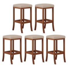 Kit 5 Banquetas Média Estofada Barcelona 38x64Cm Bancada Madeira Maciça Castanho Suede Bege - CCS