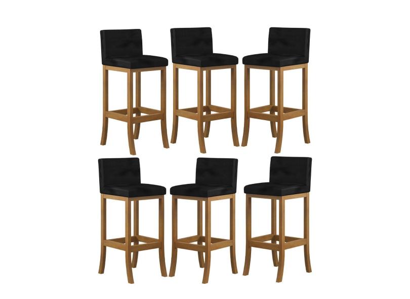 Kit 6 Banquetas Alta Encosto Estofado 38x100 Cm Ilha Espanha Madeira Maciça Amêndoa Suede Preto ccs