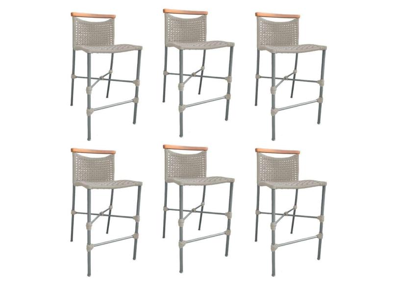Kit 6 Banquetas Anne em Corda Náutica Base em Alumínio Cinza com Detalhe em Madeira Areia