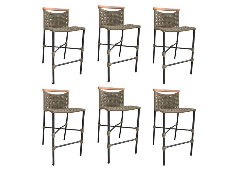 Kit 6 Banquetas Anne em Corda Náutica Base em Alumínio Preta com Detalhe em Madeira Rami