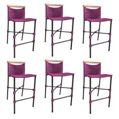 Kit 6 Banquetas Anne em Corda Náutica Base em Alumínio Preta com Detalhe em Madeira Rosa