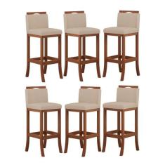 Kit 6 Banquetas Média Encosto Estofado 38x92 Cm Turim Madeira Maciça Pinhão Suede Bege CCS