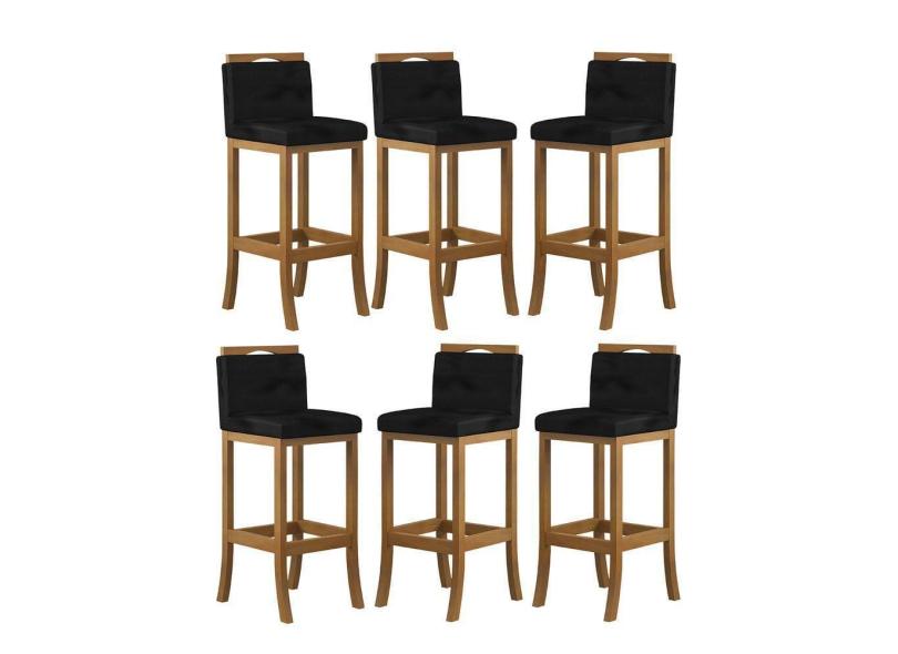 Kit 6 Banquetas Média Encosto Estofado 38x92Cm Ilha Turim Madeira Maciça Amêndoa Suede Preto CCS