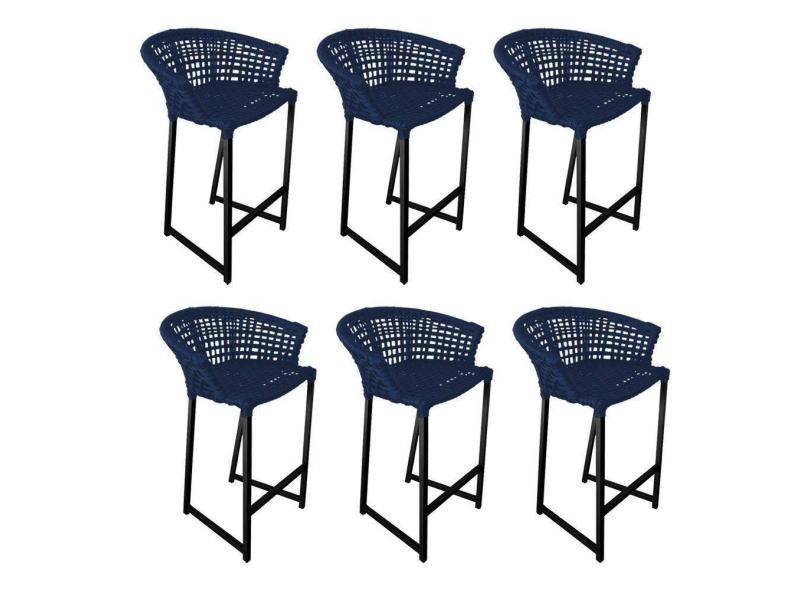 Kit 6 Banquetas Reis Em Corda Náutica E Base Em Alumínio Preta Para área Gourmet Azul Marinho Azul