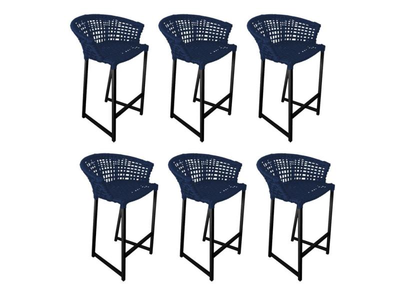 Kit 6 Banquetas Reis em Corda Náutica e Base em Alumínio Preta para Área Gourmet Azul Marinho