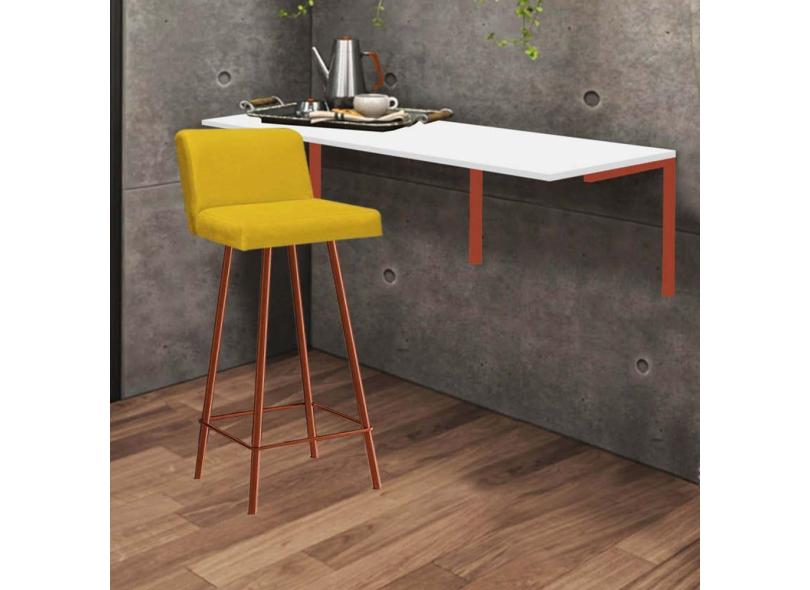 Kit Mesa Suspensa de Parede Fixa MDF Branco + 1 Banqueta Lexi Ferro Bronze Sintético Amarelo - Ahazzo Móveis