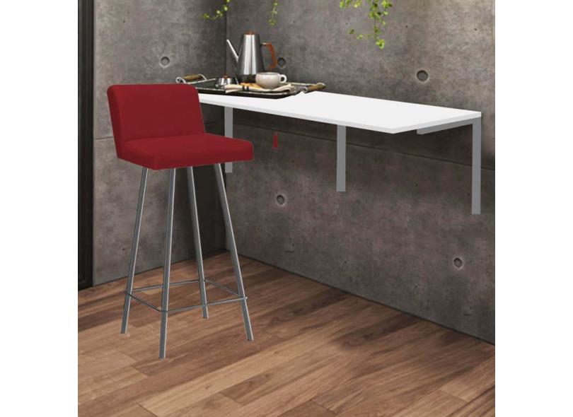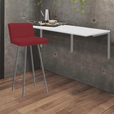 Kit Mesa Suspensa de Parede Fixa MDF Branco + 1 Banqueta Lexi Ferro Prata Corino Vermelho - Ahazzo Móveis