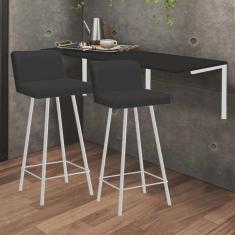 Kit Mesa Suspensa de Parede Fixa MDF Branco + 2 Banquetas Lexi Ferro Preto Sintético Preto - Ahazzo Móveis
