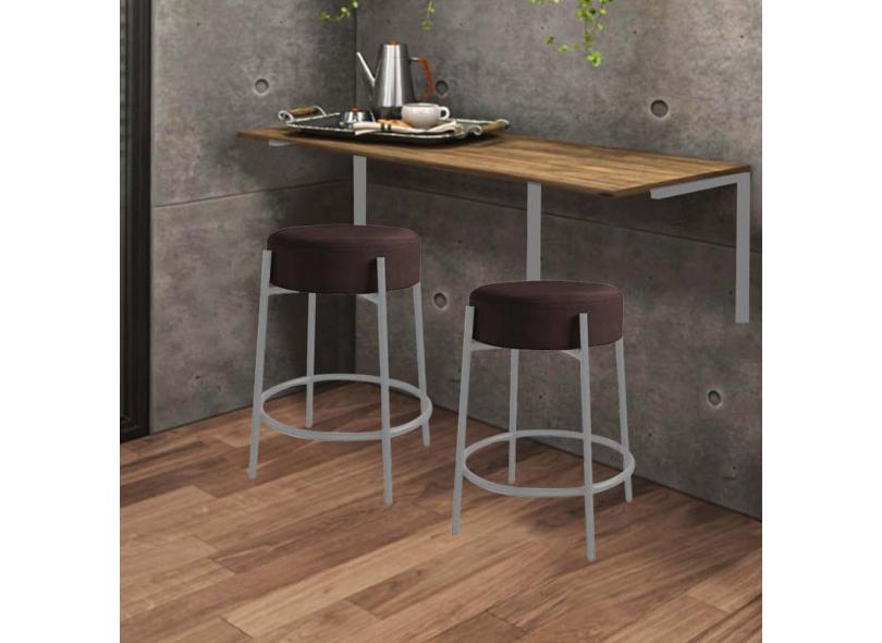 Kit Mesa Suspensa de Parede Fixa MDF Castanho + 2 Banquetas Sintra Ferro Prata Corino Marrom - Ahazzo Móveis