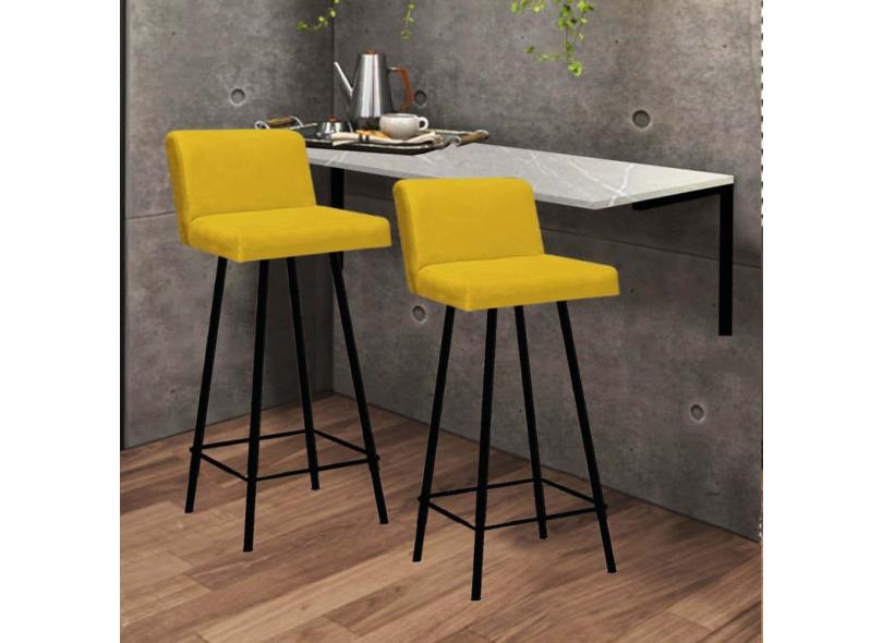 Kit Mesa Suspensa de Parede Fixa MDF Marmorizado + 2 Banquetas Lexi Ferro Preto Corino Amarelo - Ahazzo Móveis