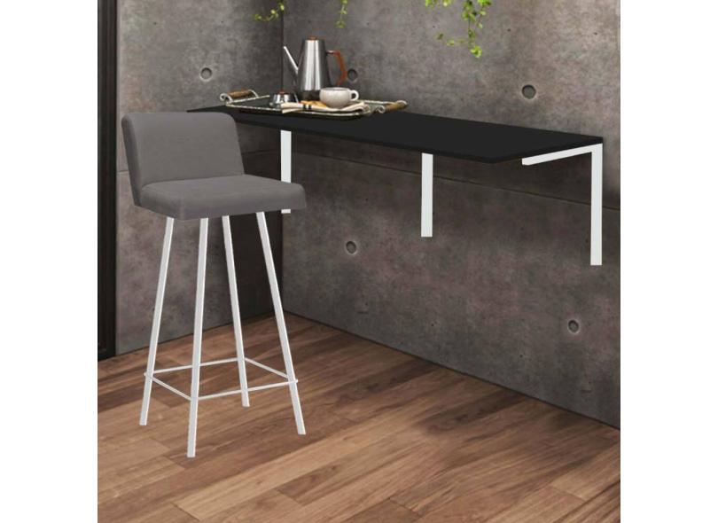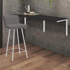 Kit Mesa Suspensa de Parede Fixa MDF Preto + 1 Banqueta Lexi Ferro Branco Sintético Cinza - Ahazzo Móveis