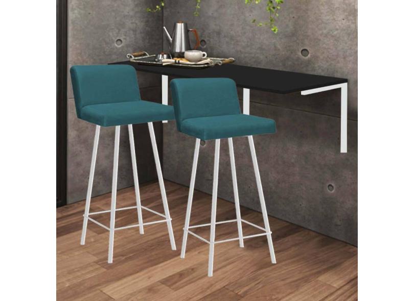 Kit Mesa Suspensa de Parede Fixa MDF Preto + 2 Banquetas Lexi Ferro Branco Suede Azul Turquesa - Ahazzo Móveis