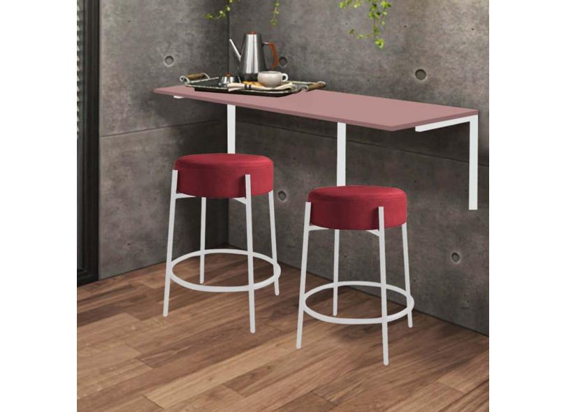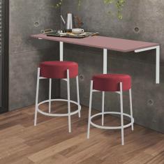 Kit Mesa Suspensa de Parede Fixa MDF Rosa + 2 Banquetas Sintra Ferro Branco Suede Vermelho - Ahazzo Móveis