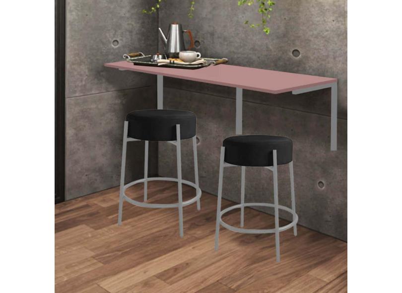 Kit Mesa Suspensa de Parede Fixa MDF Rosa + 2 Banquetas Sintra Ferro Prata Sintético Preto - Ahazzo Móveis