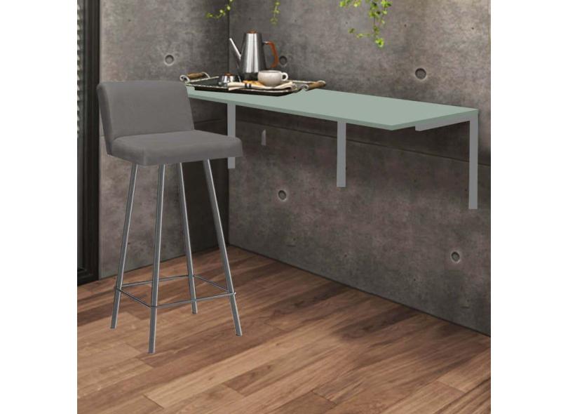 Kit Mesa Suspensa de Parede Fixa MDF Verde Oliva + 1 Banqueta Lexi Ferro Prata Corino Cinza - Ahazzo Móveis