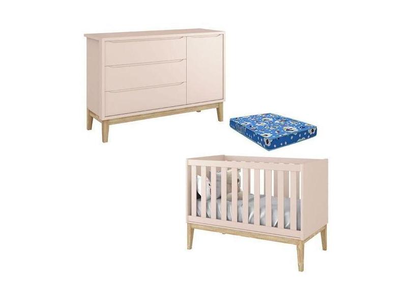 Berço Americano Com Colchão E Cômoda Classic Rosa Pés Madeira Natural