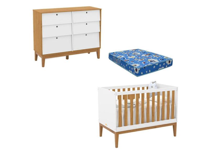 Berço Americano e Cômoda 6 Gavetas Unique Branco Soft Freijó Eco Wood com Colchão Ortobom - Matic
