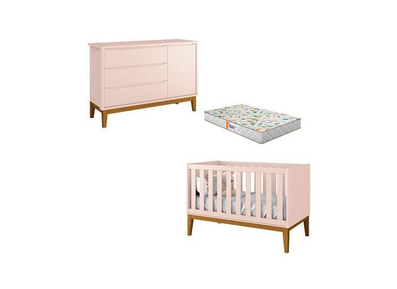 Berço Americano e Cômoda New Classic Rosa com Pés Madeira e Colchão Ga
