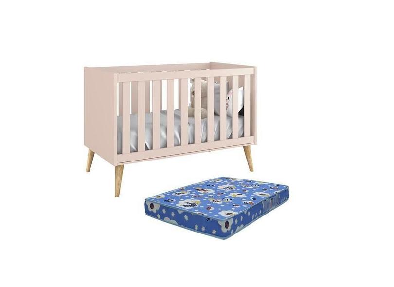 Berço Americano Theo Rosa Fosco Pés Madeira Natural com Colchão D18 -