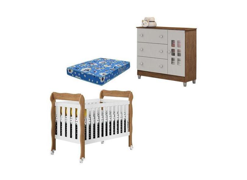 Berço Lila e Cômoda Mariah Branco Acetinado Amadeirado com Colchão - C
