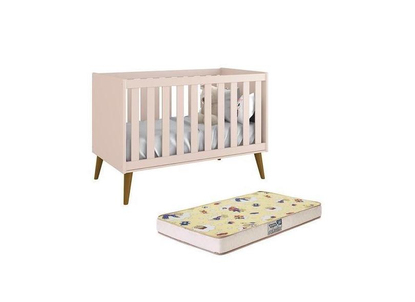 Berço Mini Cama Theo Retrô Rosa Fosco com Pés Amadeirado e Colchão D18