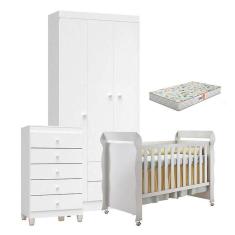 Quarto de Bebê 3 Portas com Gaveteiro Ternura Baby e Berço Mirelle Branco Brilho com Colchão Gazin - Incorplac
