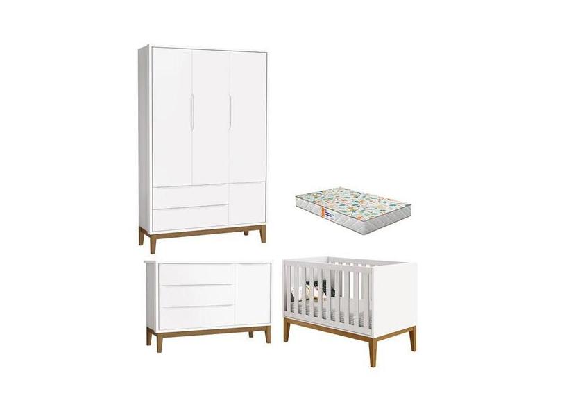 Quarto de Bebê 3 Portas New Classic Branco com Pés Madeira e Colchão G