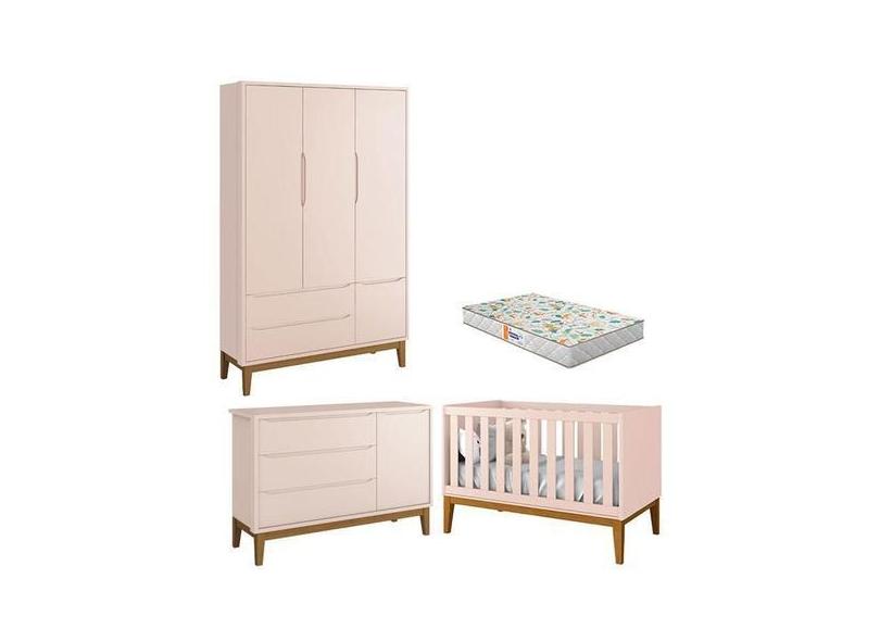 Quarto de Bebê 3 Portas New Classic Rosa com Pés Madeira e Colchão Gaz
