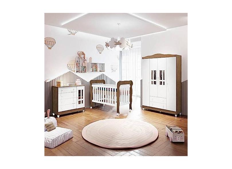 Quarto de Bebê Ariel Berço 3 em 1 Lila Guarda Roupa 4 Portas Cômoda Infantil Branco Amadeirado Carolina Baby