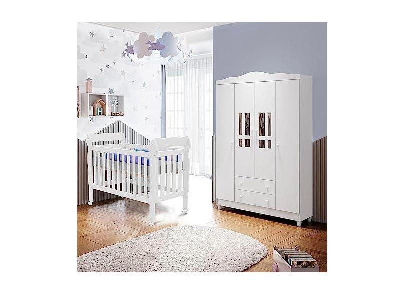 Quarto de Bebê Ariel Berço 3 em 1 Lila Guarda Roupa 4 Portas Infantil Branco Carolina Baby