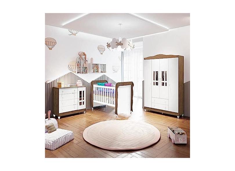 Quarto de Bebê Ariel Berço Mini Cama Mirelle Guarda Roupa Cômoda Infantil Branco Amadeirado Carolina Baby