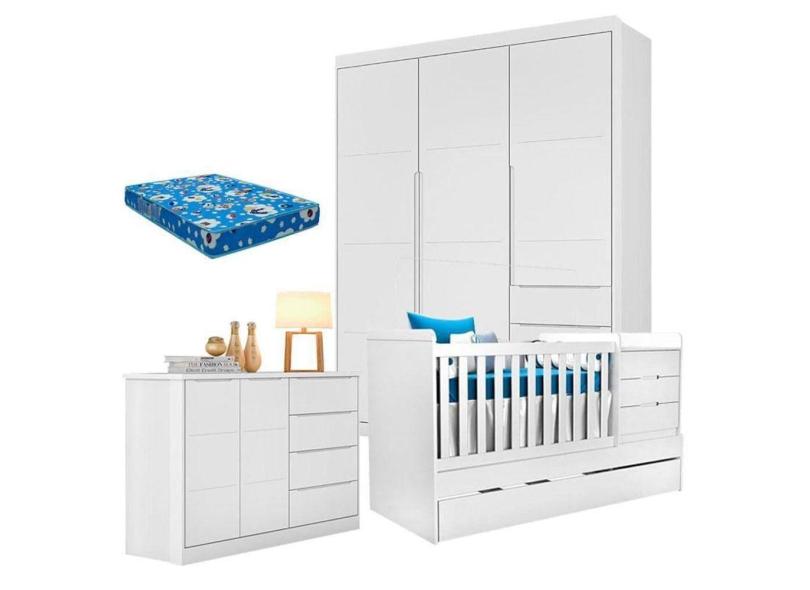 Quarto De Bebê Blenda Com Berço Multifuncional Cleo Branco Acetinado E Colchão - Phoenix