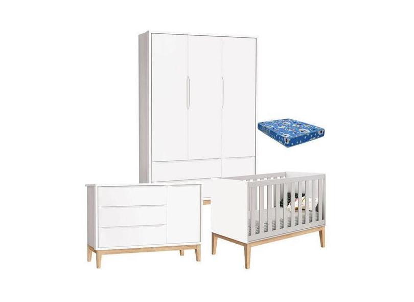 Quarto de Bebê Classic 3 Portas com Colchão Branco Pés Madeira Natural