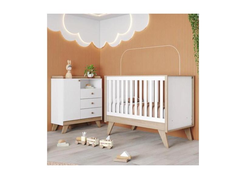 Quarto de Bebê com Berço 3 em 1 e Cômoda 3 Gavetas 1 Porta Retrô Theo
