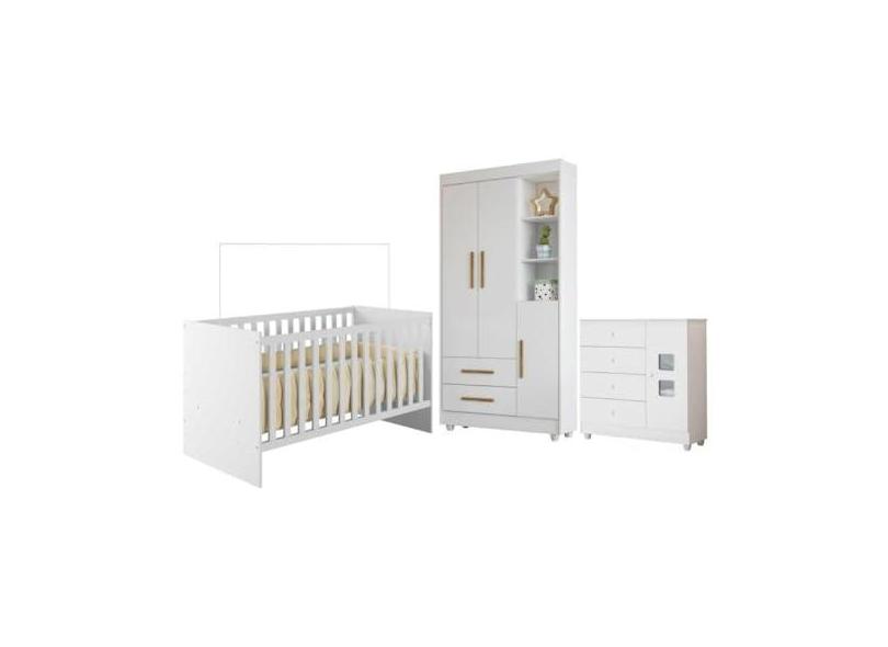Quarto de Bebê com Berço com Suporte, Cômoda 1 Porta 4 Gavetas e Roupeiro Flocos 3 Portas 2 Gavetas Branco