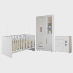 Quarto de Bebê com Berço com Suporte, Cômoda 1 Porta 4 Gavetas e Roupeiro Flocos 3 Portas 2