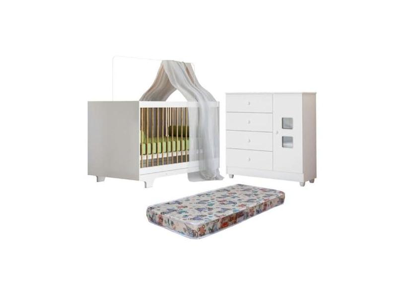 Quarto de Bebê com Berço Mini Cama com Colchão Flocos e Cômoda 100% Mdf 1 Porta 4 Gavetas Life Branco
