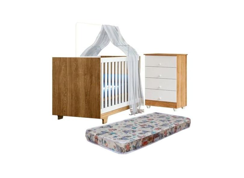 Quarto de Bebê com Berço Mini Cama com Colchão Life e Cômoda de Bebê 100% Mdf 4 Gavetas Soft Life Branco/madeirado Ypê