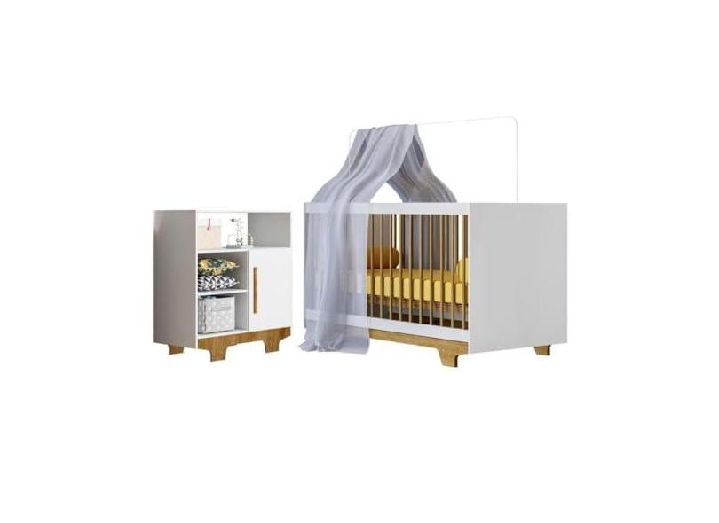 Quarto de Bebê com Berço Mini Cama Flocos e Cômoda 100% Mdf 1 Porta 3 Prateleiras Flocos Branco/madeirado Ypê