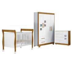 Quarto de Bebê com Berço Mini Cama Slim, Cômoda 1 Porta 4 Gavetas e Roupeiro 4 Portas 2 Gavetas Branco/madeirado Ypê