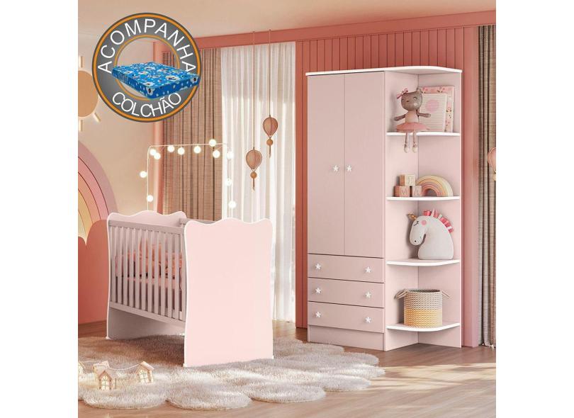 Quarto de Bebê Doce Sonho com Roupeiro 825 e Berço Simples 1 Qmovi Rosa Acetinado + Colchão Ortobom