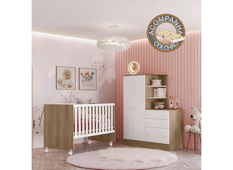 Quarto de Bebê Doce Sonho com Roupeiro + Berço Carvalho Branco Qmovi + Colchão Gazin