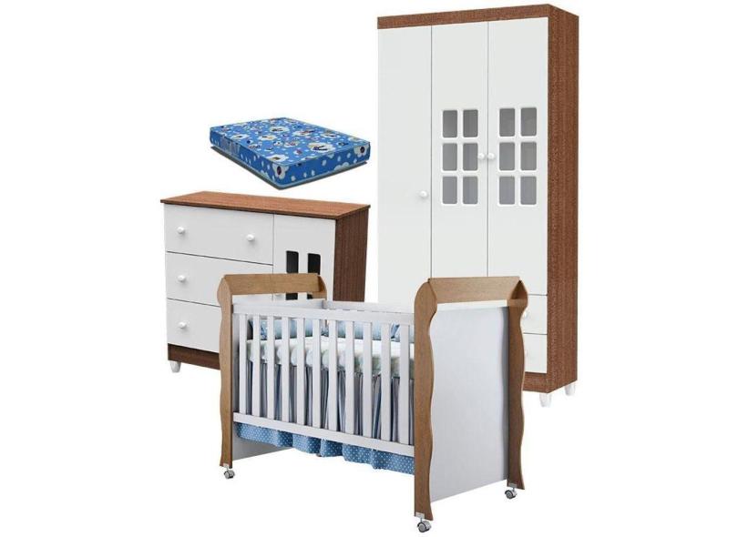Quarto De Bebê Mariah 3p Com Berço Mirelle Branco Acetinado Amadeirado Com Colchão - Carolina