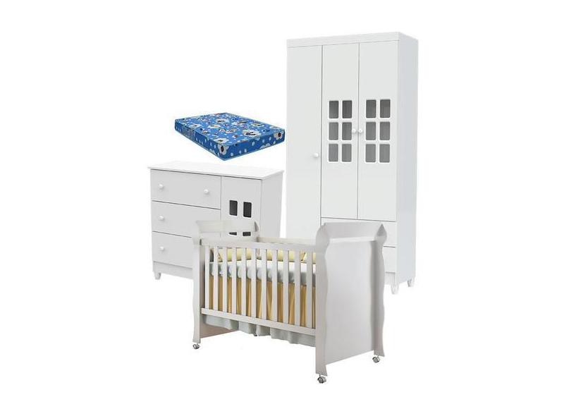 Quarto de Bebê Mariah 3P com Berço Mirelle Branco Brilho com Colchão -