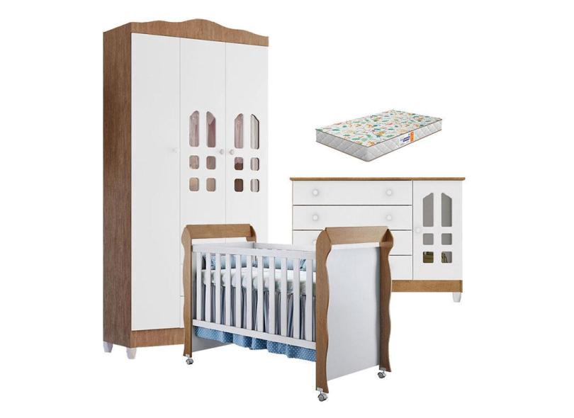 Quarto de Bebê New Selena 3 Portas com Cômoda Gran Selena e Berço Mirelle Branco Acetinado Amadeirado e Colchão Gazin – Carolina Móveis