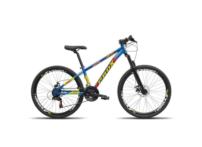 Bicicleta aro 26 Freeride PRO X Mandrake Hiten 21 Velocidades Freio a Disco Aros Vmaxx Azul Adesivo Amarelo e Vermelho